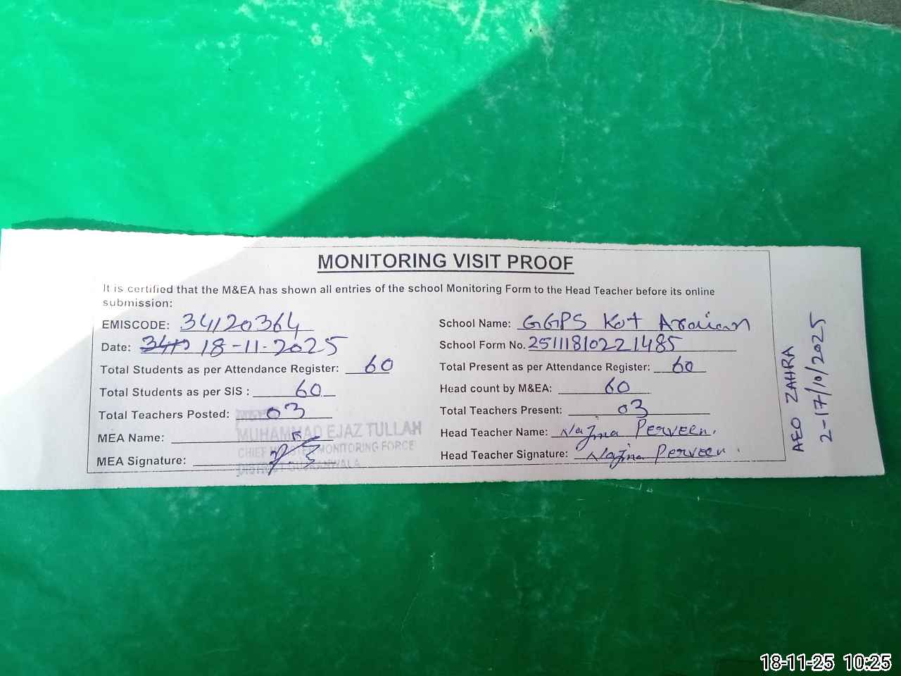 | EMIS Code: 34120364 | Name of School: GGPS KOT ARAIAN | |||