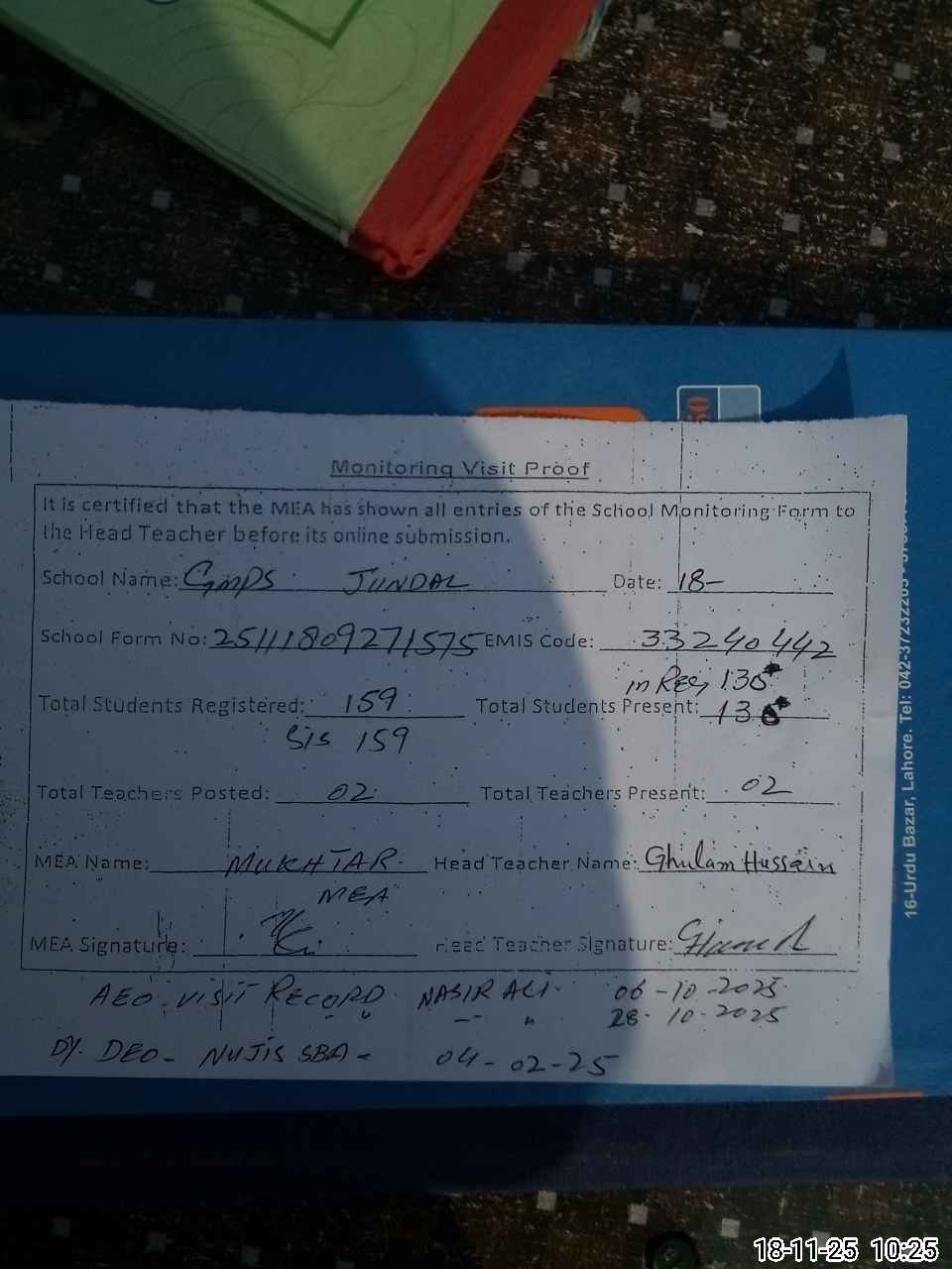 | Attendance Register | Head Teacher | MEA with School | Visit Proof |
