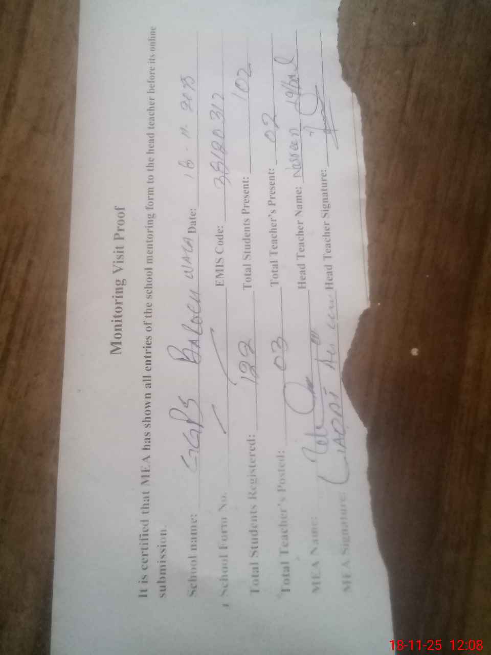 | Attendance Register | Head Teacher | MEA with School | Visit Proof |