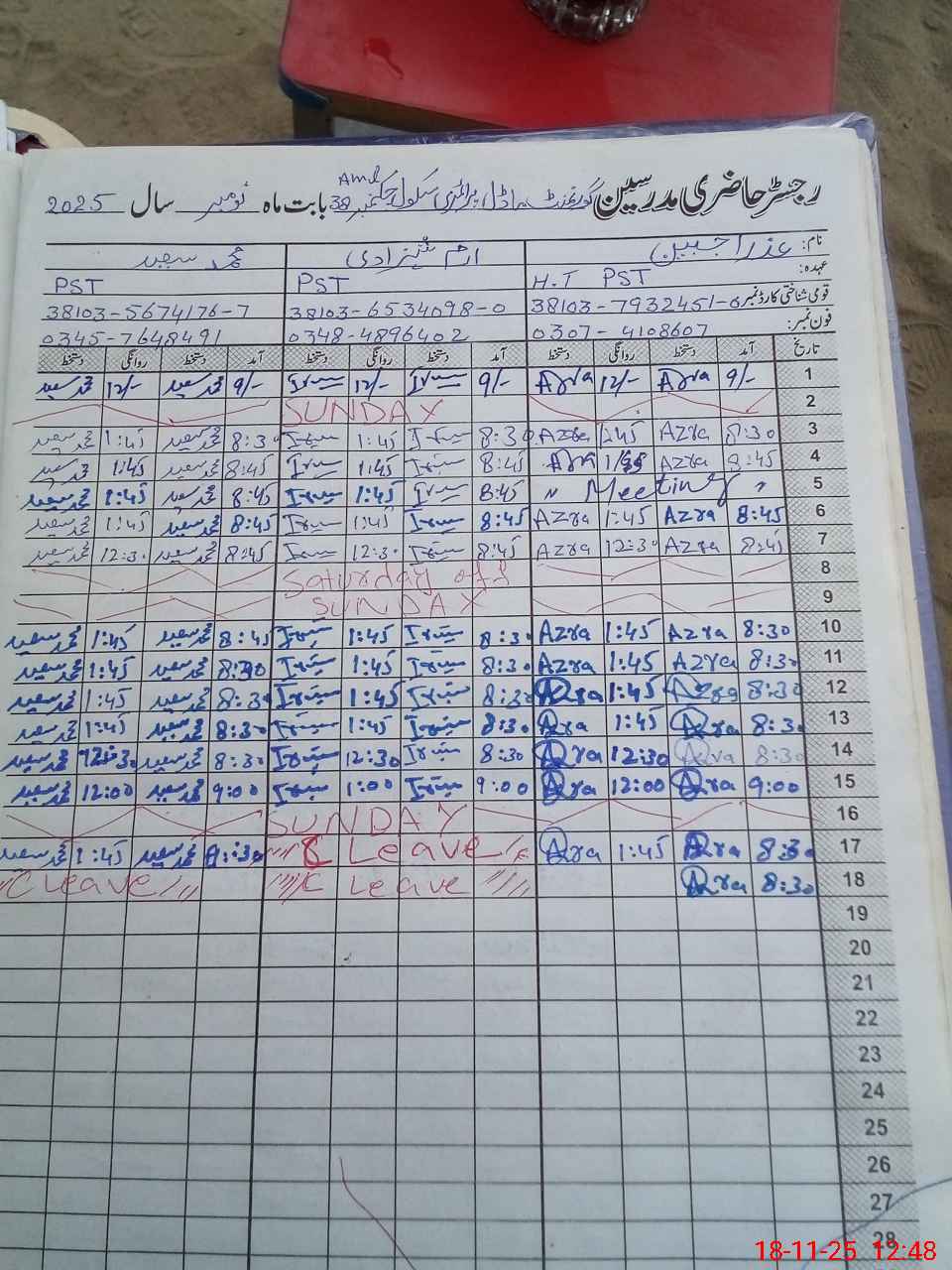 | CNIC | Full Name | Designation | R/C | Absence During Last Calender Month |