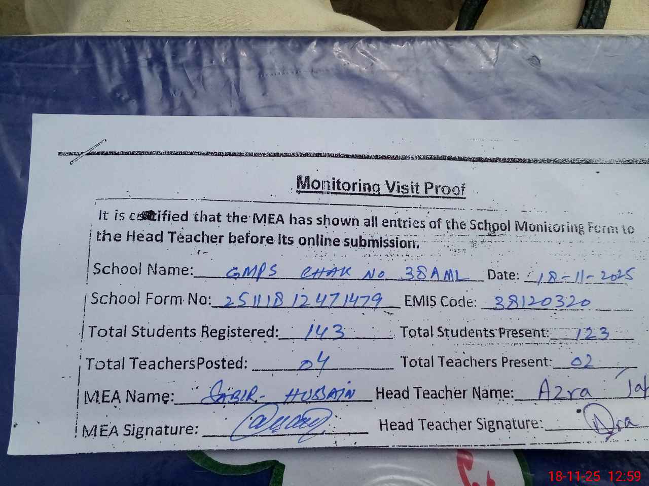 | Attendance Register | Head Teacher | MEA with School | Visit Proof |