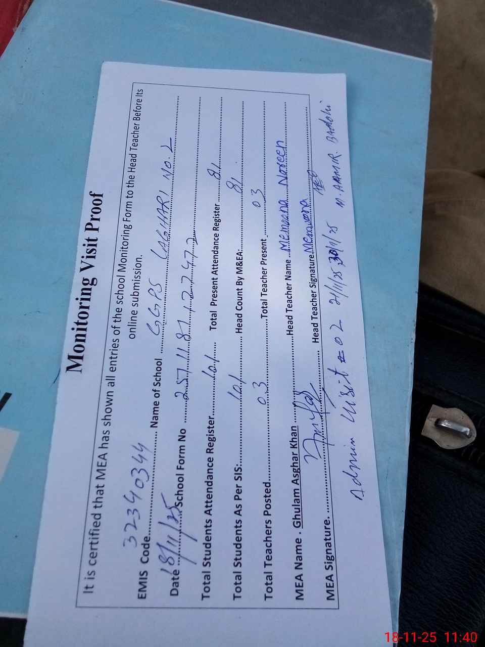 | Attendance Register | Head Teacher | MEA with School | Visit Proof |