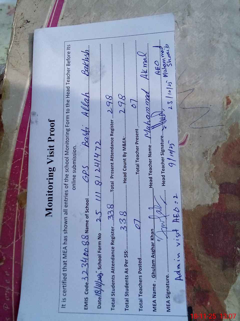 | Attendance Register | Head Teacher | MEA with School | Visit Proof |