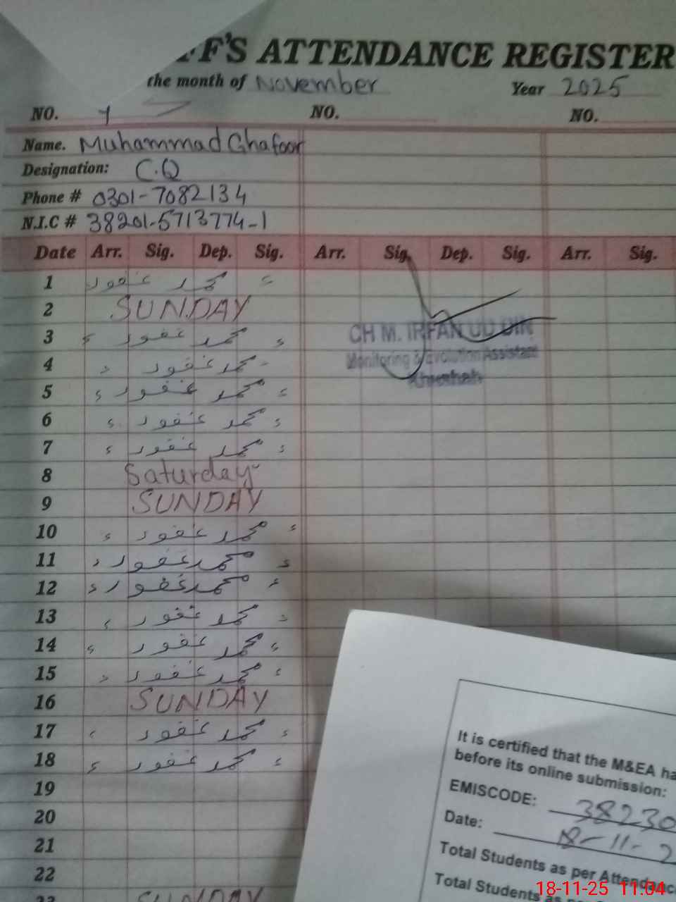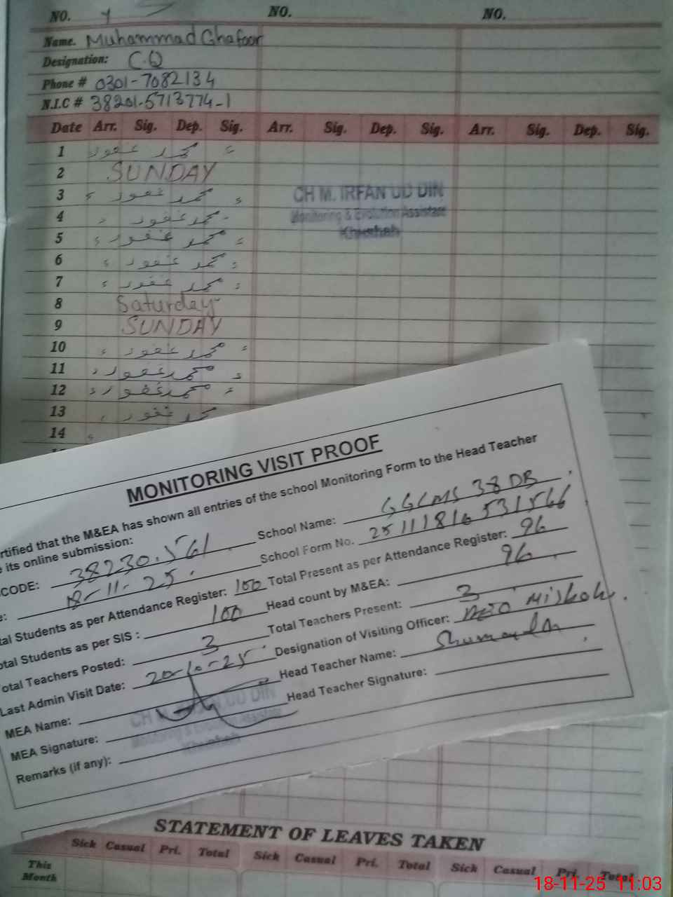 | Remarks (Use Separate Page if Required): Ggcms 38 db Student on sis 135 Student on register 100 Head count 96 No teacher absent Last visit aeo misbah on20oct Teacher ng staff required | |||||