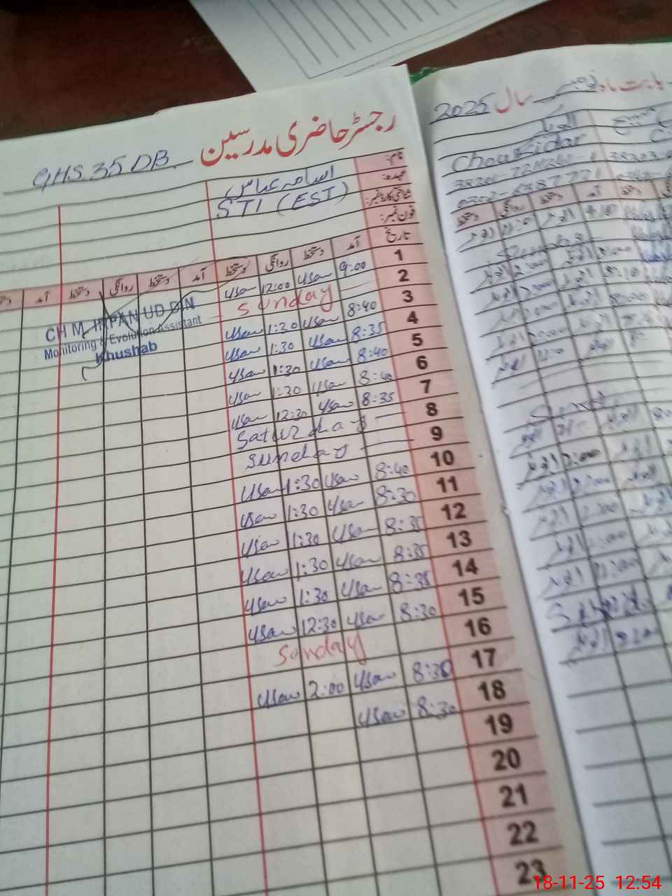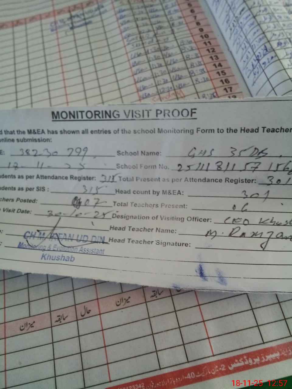 | Remarks (Use Separate Page if Required): Ghs 35 DB Student on sis 315 Student on register 315 Head count 301 No teacher absent one on duty Last visit CEO khushab 30oct Teaching staff required Science lab equipment with furniture required Furniture for teacher is too old required new furniture Toilets required | |||||