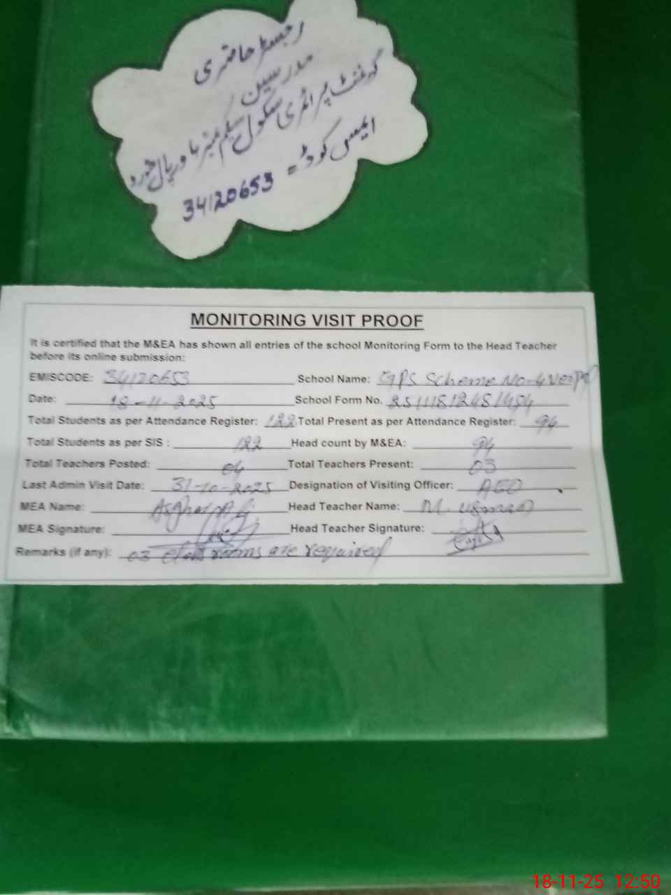 | Attendance Register | Head Teacher | MEA with School | Visit Proof |