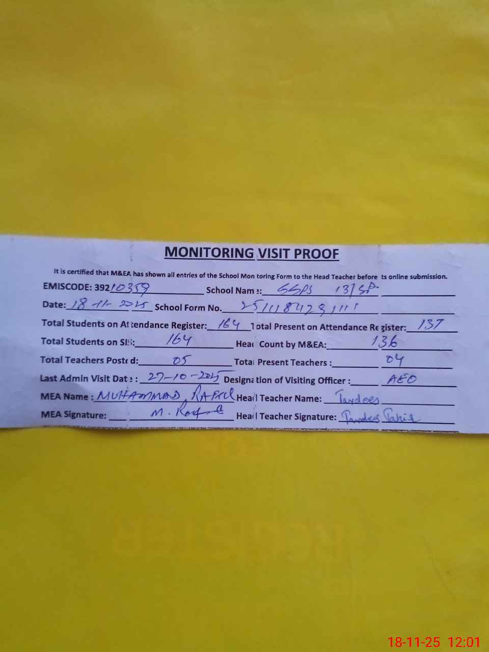| Attendance Register | Head Teacher | MEA with School | Visit Proof |