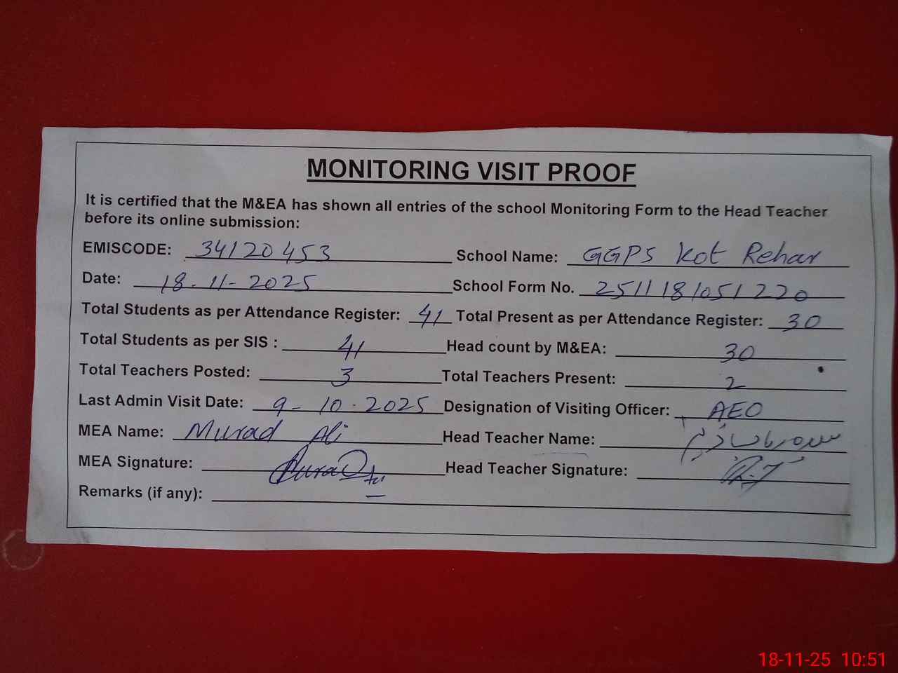 | Attendance Register | Head Teacher | MEA with School | Visit Proof |