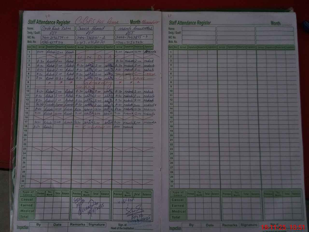 | CNIC | Full Name | Designation | R/C | Absence During Last Calender Month |