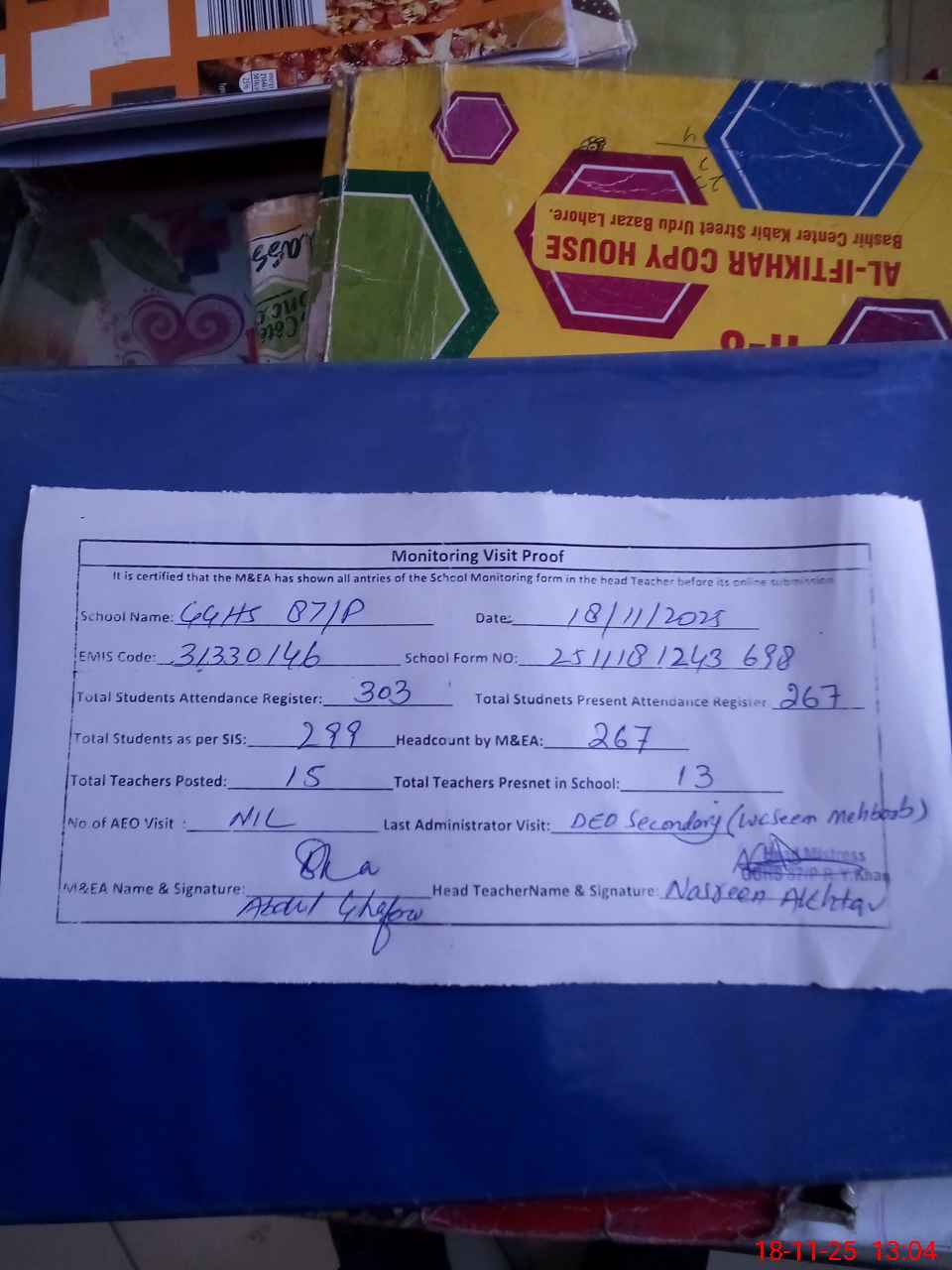 | Attendance Register | Head Teacher | MEA with School | Visit Proof |