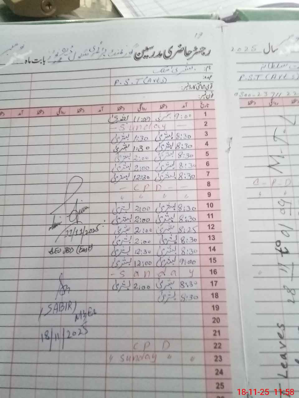 | Remarks (Use Separate Page if Required): No teacher absent 01 teacher on matrenty leave Last admin visit by AEO on 11 Nov 2025 | |||||