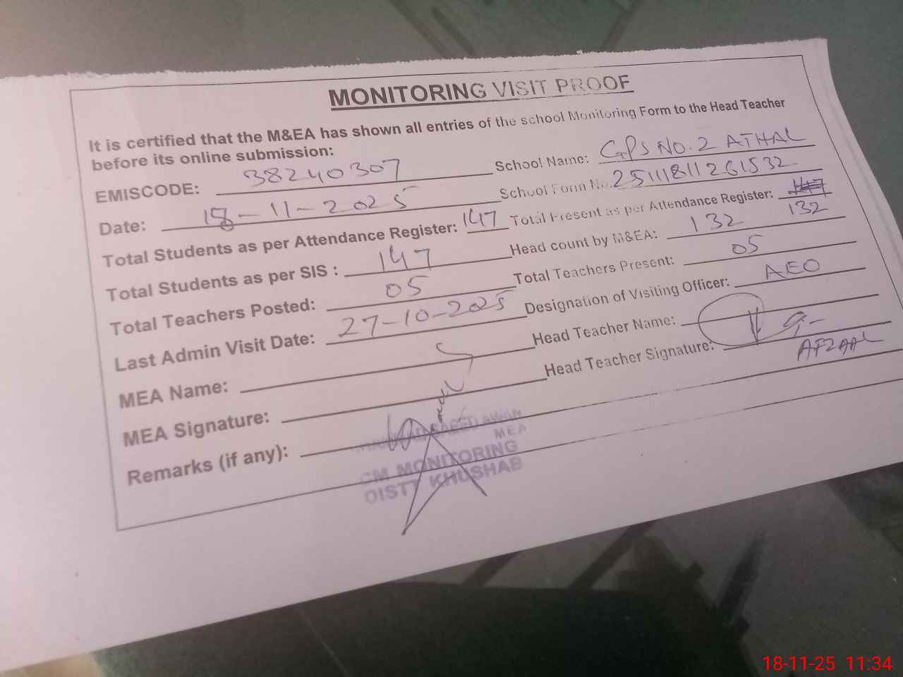 | Remarks (Use Separate Page if Required): Students on SIS QTY 147 Last admin visit On 27 October 2025 by AEO | |||||