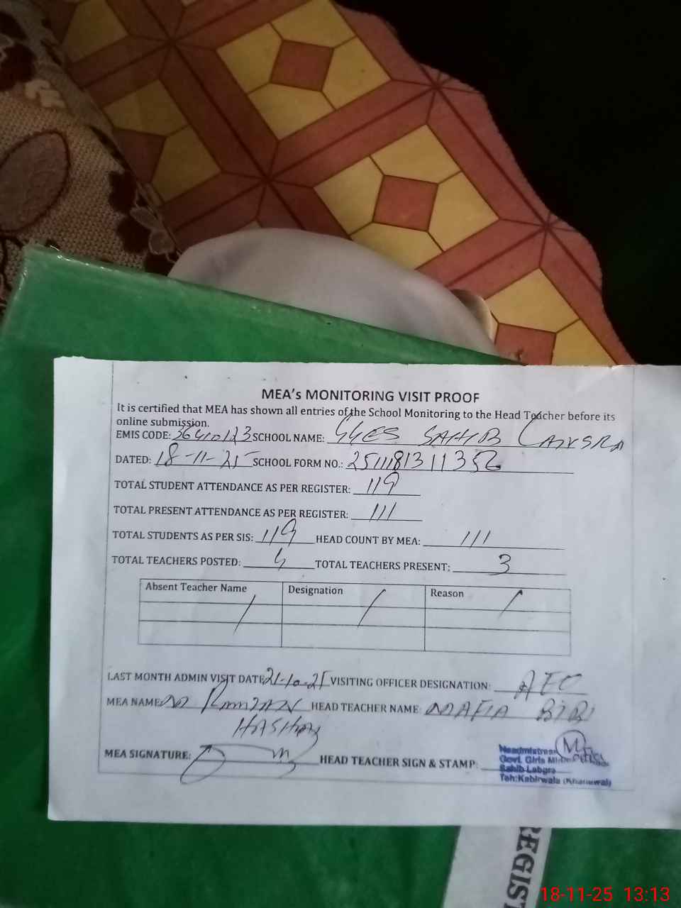 | Attendance Register | Head Teacher | MEA with School | Visit Proof |
