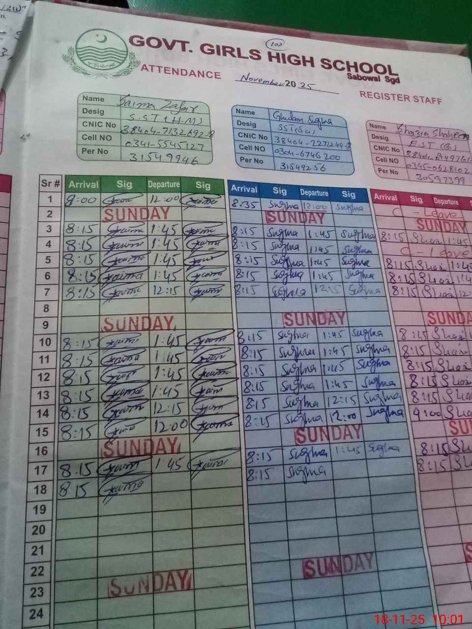 | CNIC | Full Name | Designation | R/C | Absence During Last Calender Month |