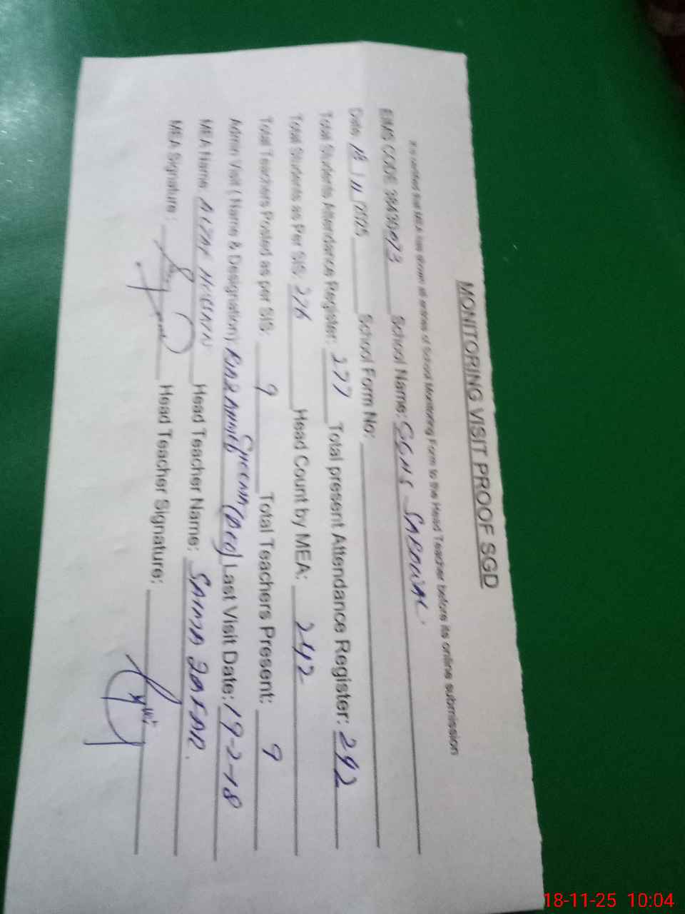 | Attendance Register | Head Teacher | MEA with School | Visit Proof |
