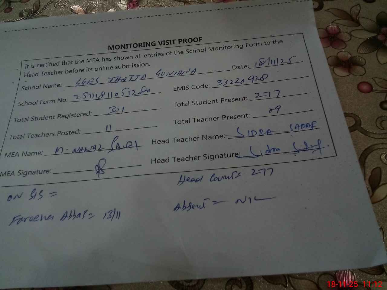 | EMIS Code: 33220928 | Name of School: GGES THATTA GUNIANA | |||