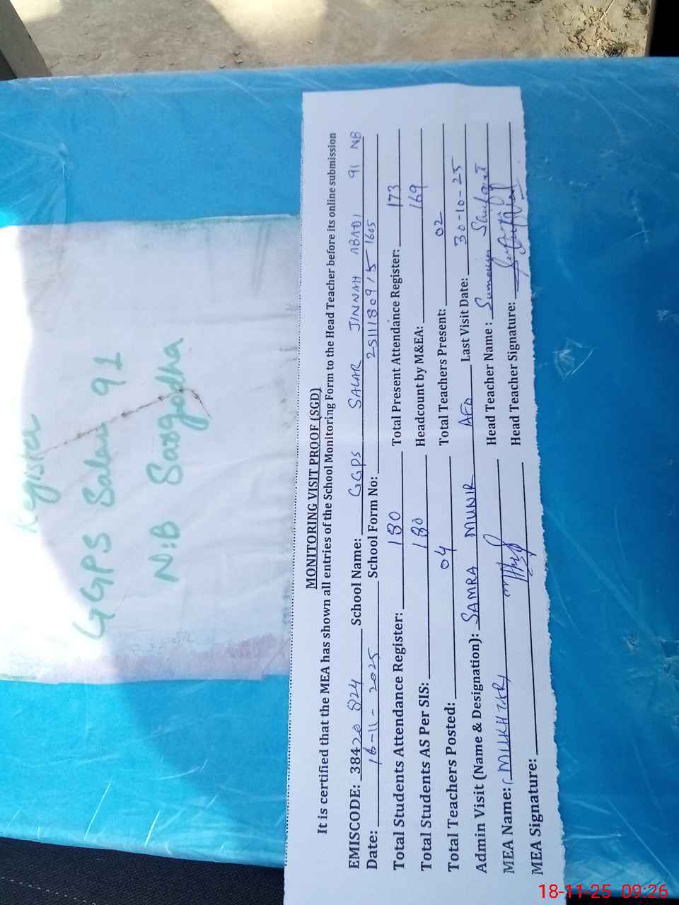| Attendance Register | Head Teacher | MEA with School | Visit Proof |