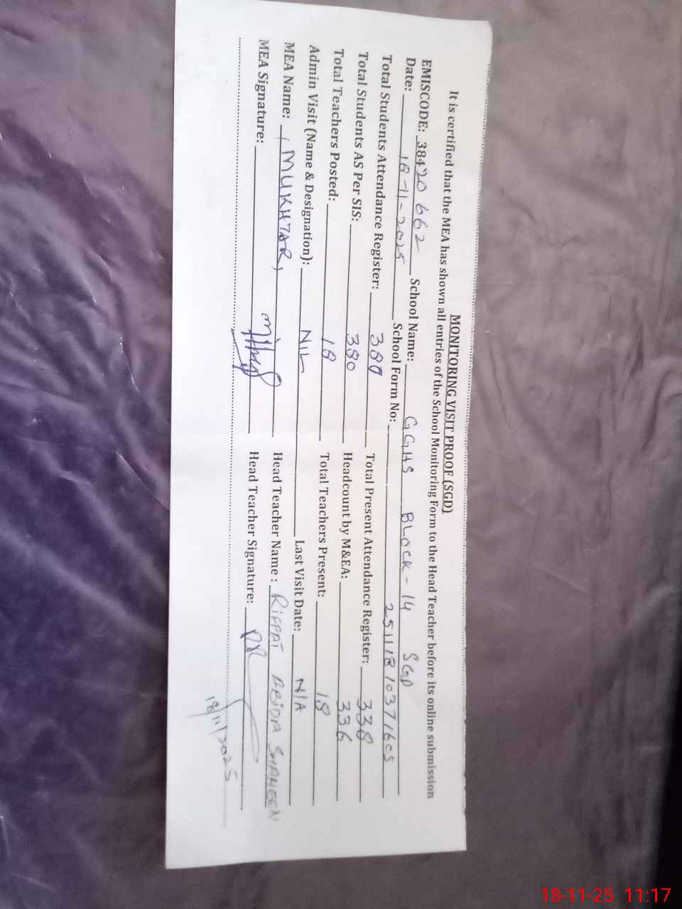 | EMIS Code: 38420662 | Name of School: GGHS MC BLOCK NO.14 SARGODHA | |||
