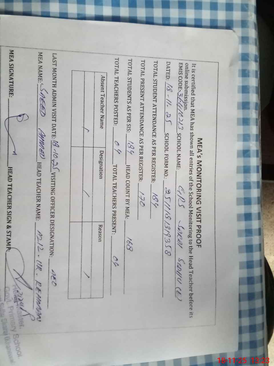 | Attendance Register | Head Teacher | MEA with School | Visit Proof |