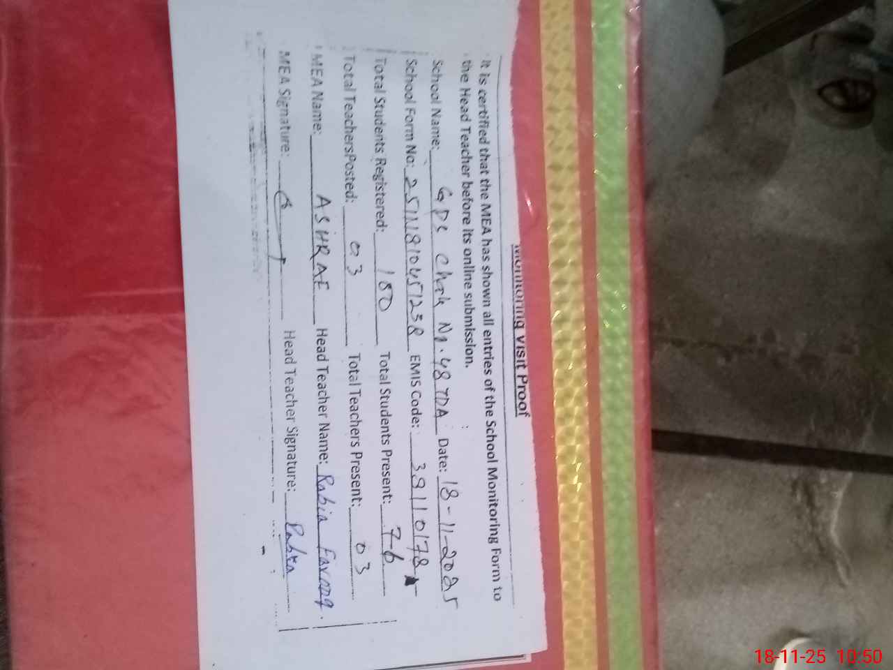 | Attendance Register | Head Teacher | MEA with School | Visit Proof |