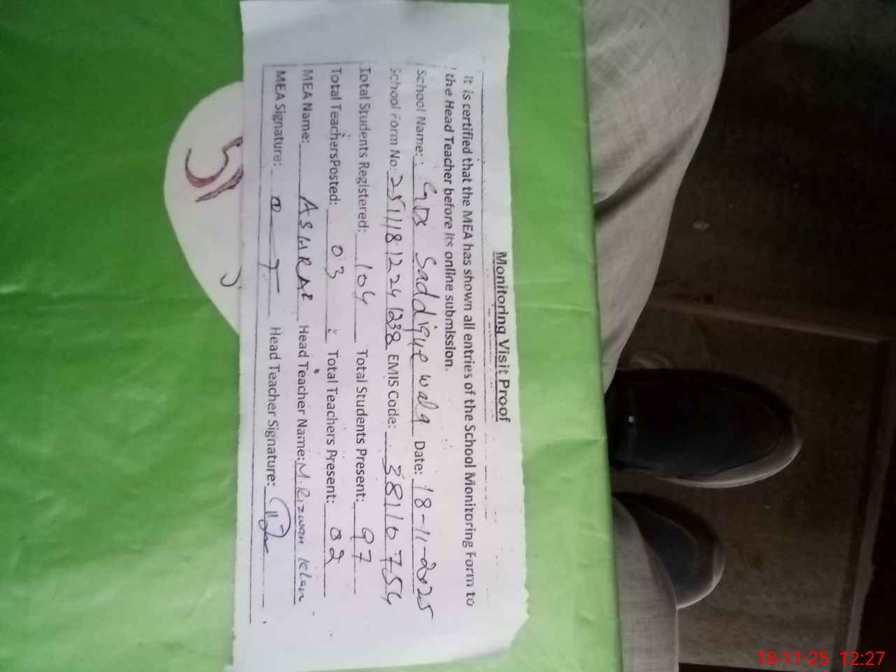 | Attendance Register | Head Teacher | MEA with School | Visit Proof |