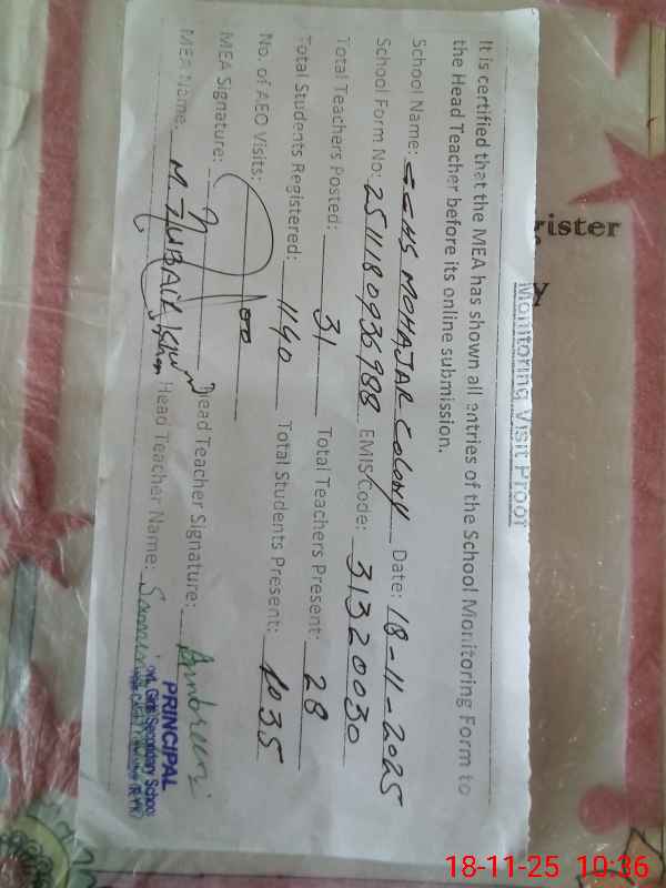 | EMIS Code: 31320030 | Name of School: GGHS MOHAJAR COLONY LQP | |||