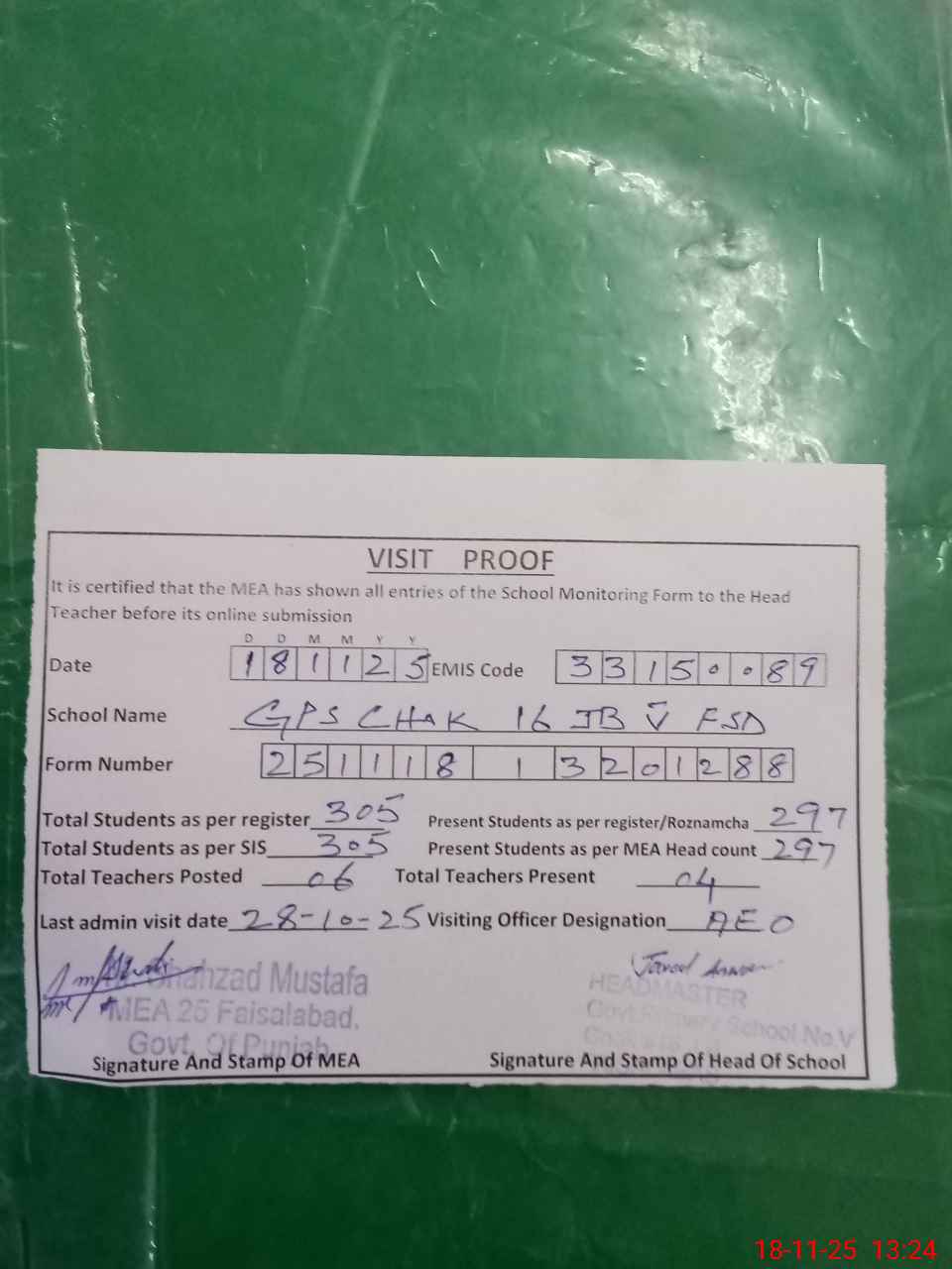 | Attendance Register | Head Teacher | MEA with School | Visit Proof |