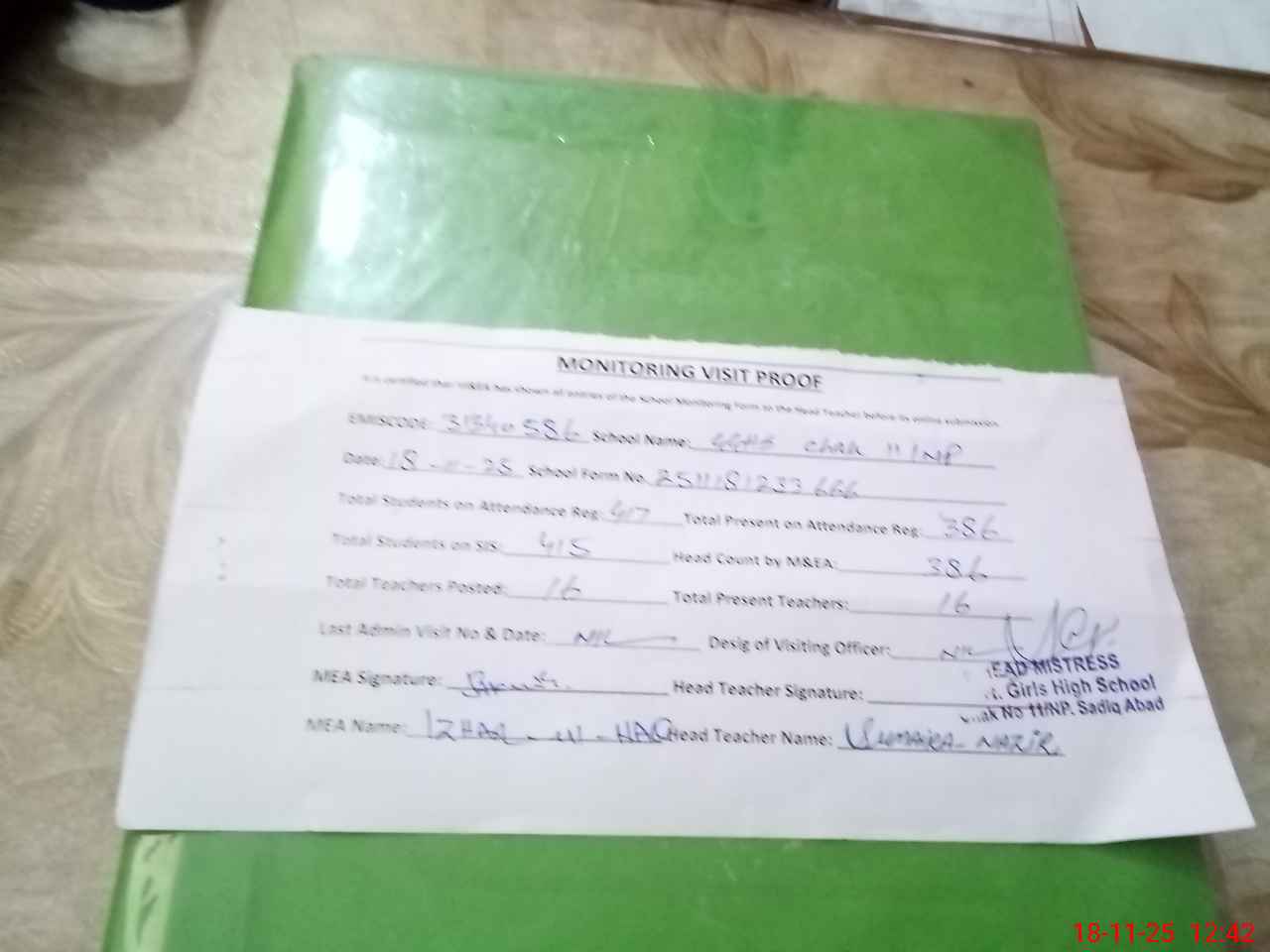 | Attendance Register | Head Teacher | MEA with School | Visit Proof |