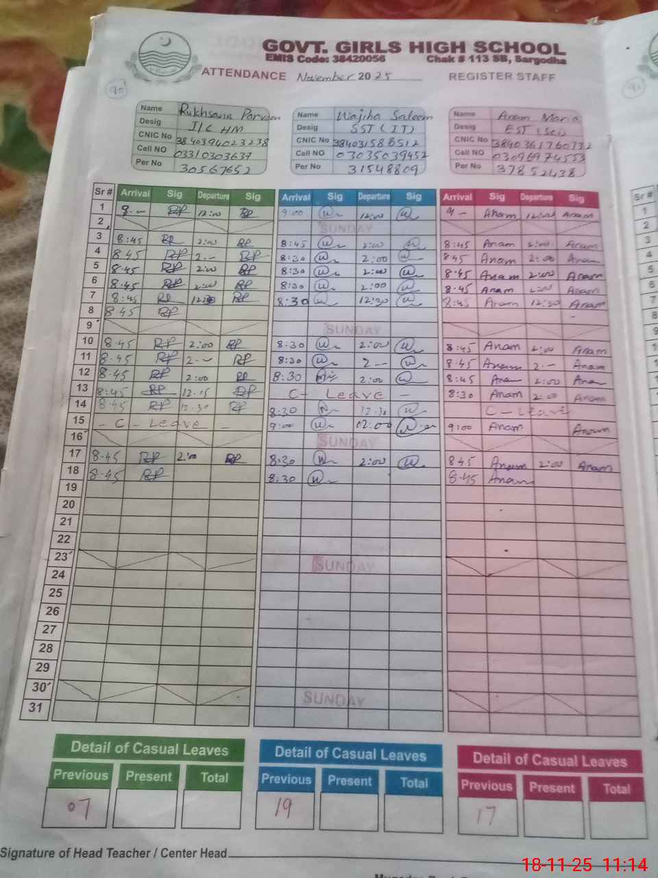 | CNIC | Full Name | Designation | R/C | Absence During Last Calender Month |