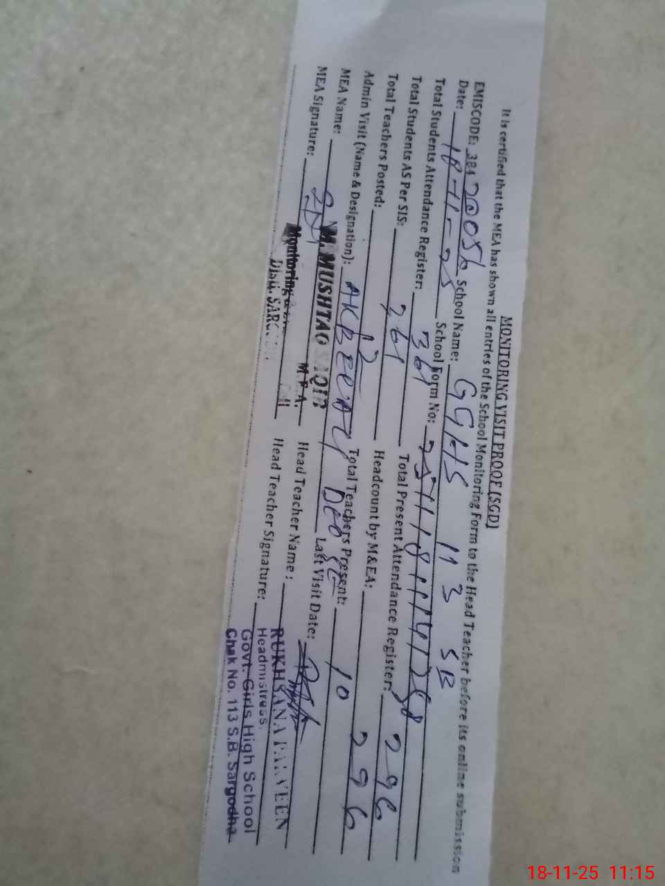 | Attendance Register | Head Teacher | MEA with School | Visit Proof |