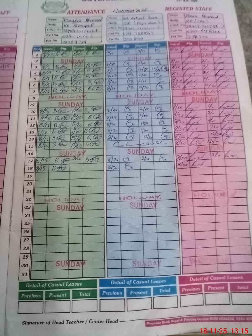 | CNIC | Full Name | Designation | R/C | Absence During Last Calender Month |