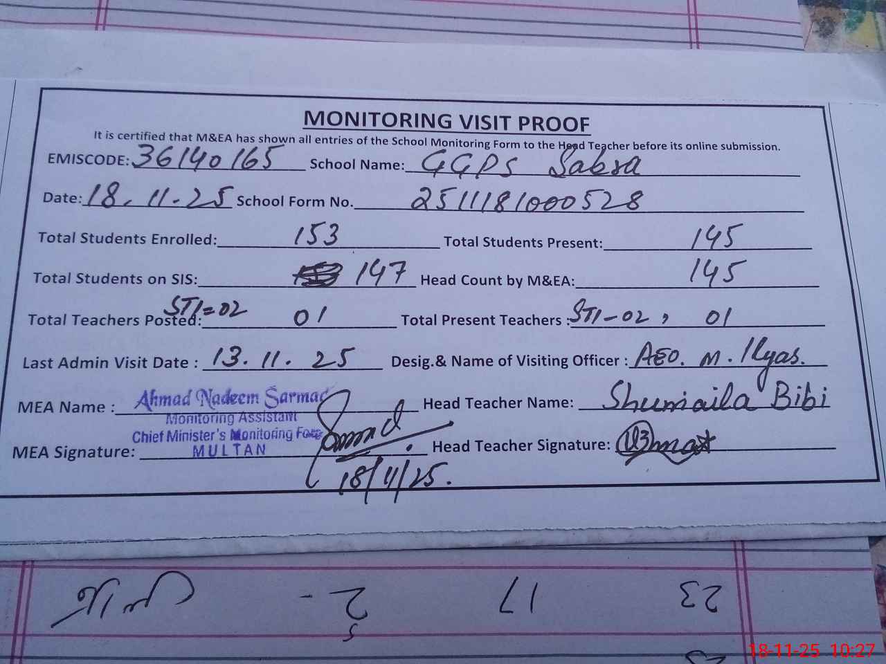 | EMIS Code: 36140165 | Name of School: GGPS SABRA JALALPUR PIRWALA | |||