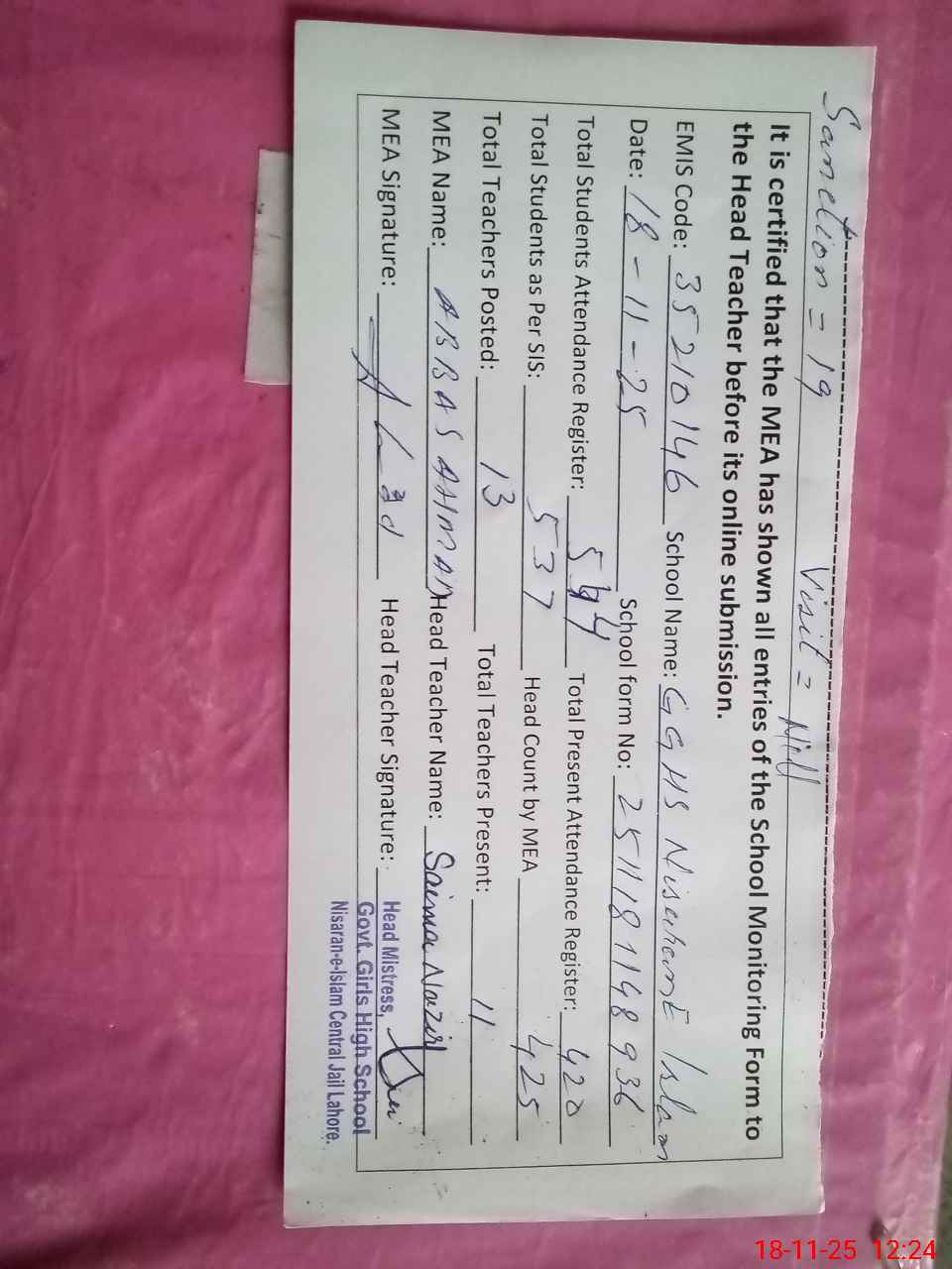 | EMIS Code: 35210145 | Name of School: GGHS NISARAN-E-ISLAM CENTRAL JAIL(Newly Upgraded) | |||