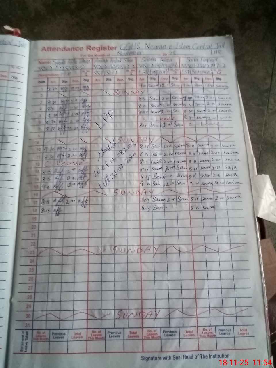 | CNIC | Full Name | Designation | R/C | Absence During Last Calender Month |
