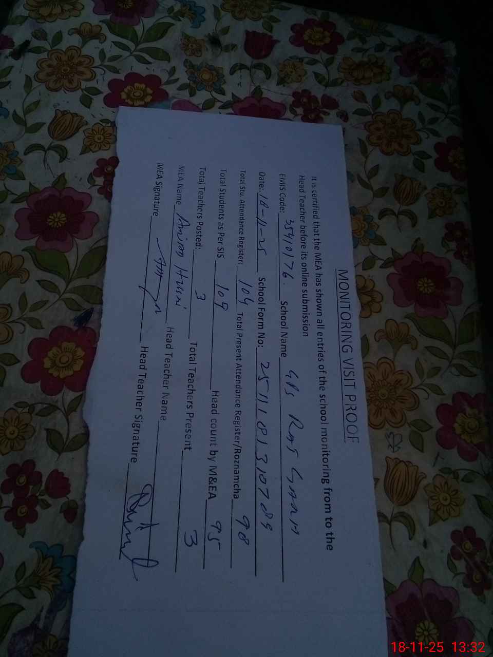 | Attendance Register | Head Teacher | MEA with School | Visit Proof |