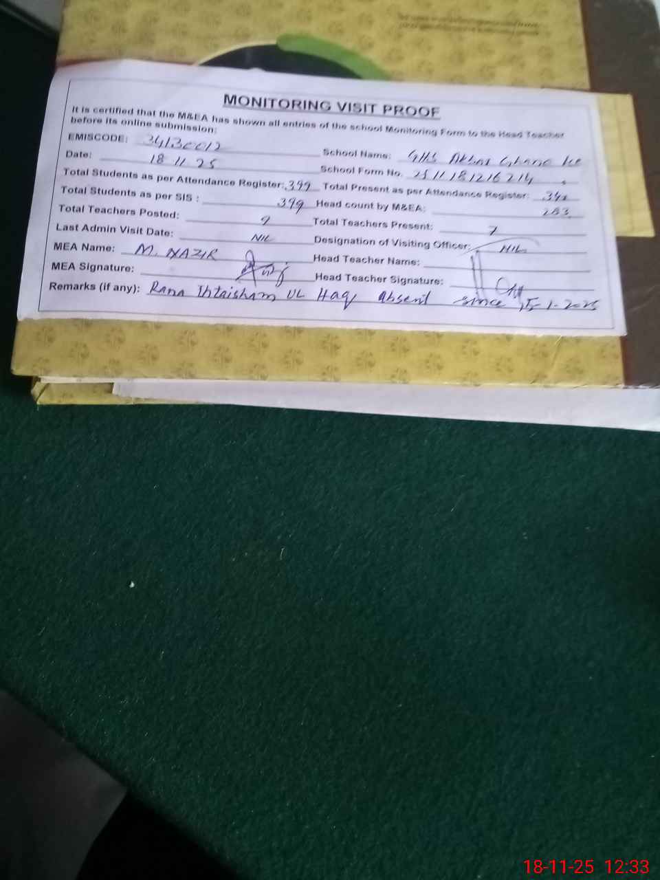 | Attendance Register | Head Teacher | MEA with School | Visit Proof |