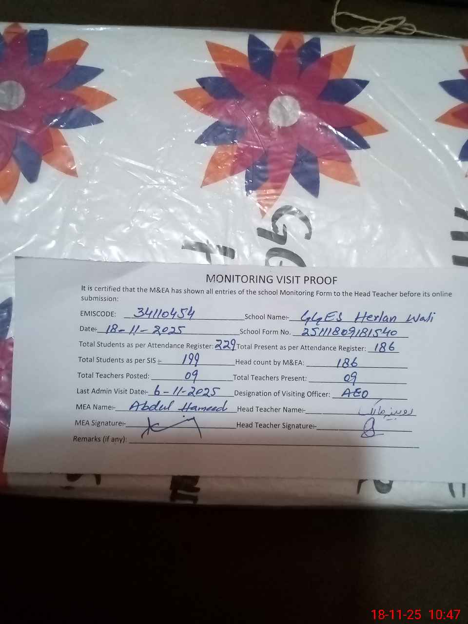 | Attendance Register | Head Teacher | MEA with School | Visit Proof |