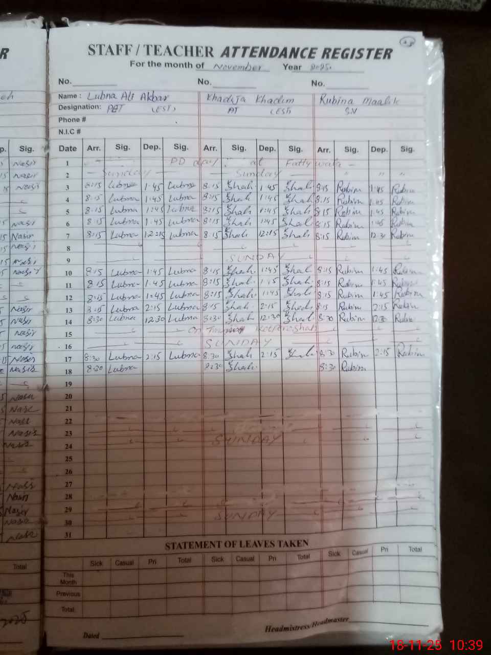 | CNIC | Full Name | Designation | R/C | Absence During Last Calender Month |