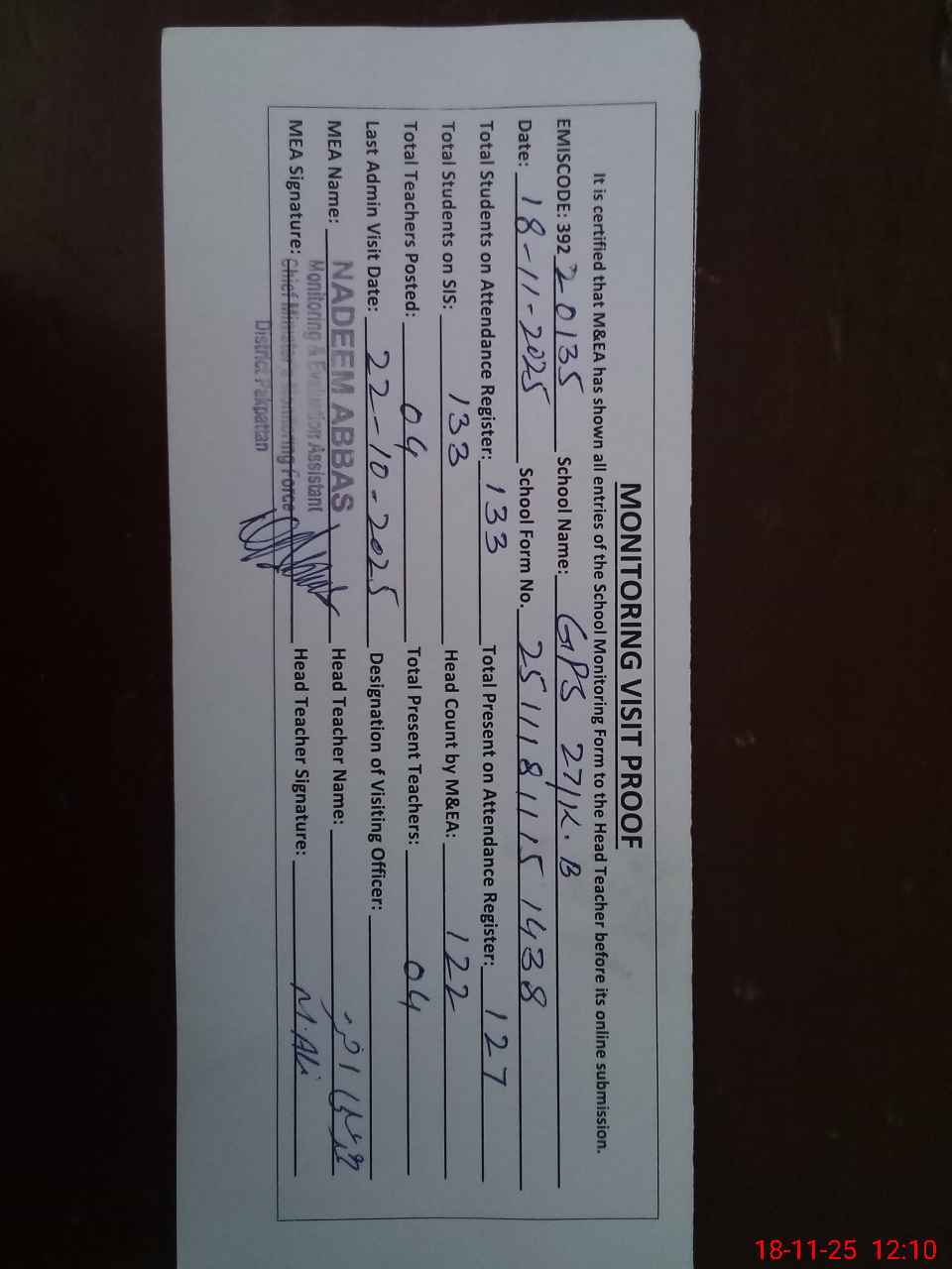 | EMIS Code: 39220135 | Name of School: GPS CHAK NO. 27 KB P.O QABOOLA | |||