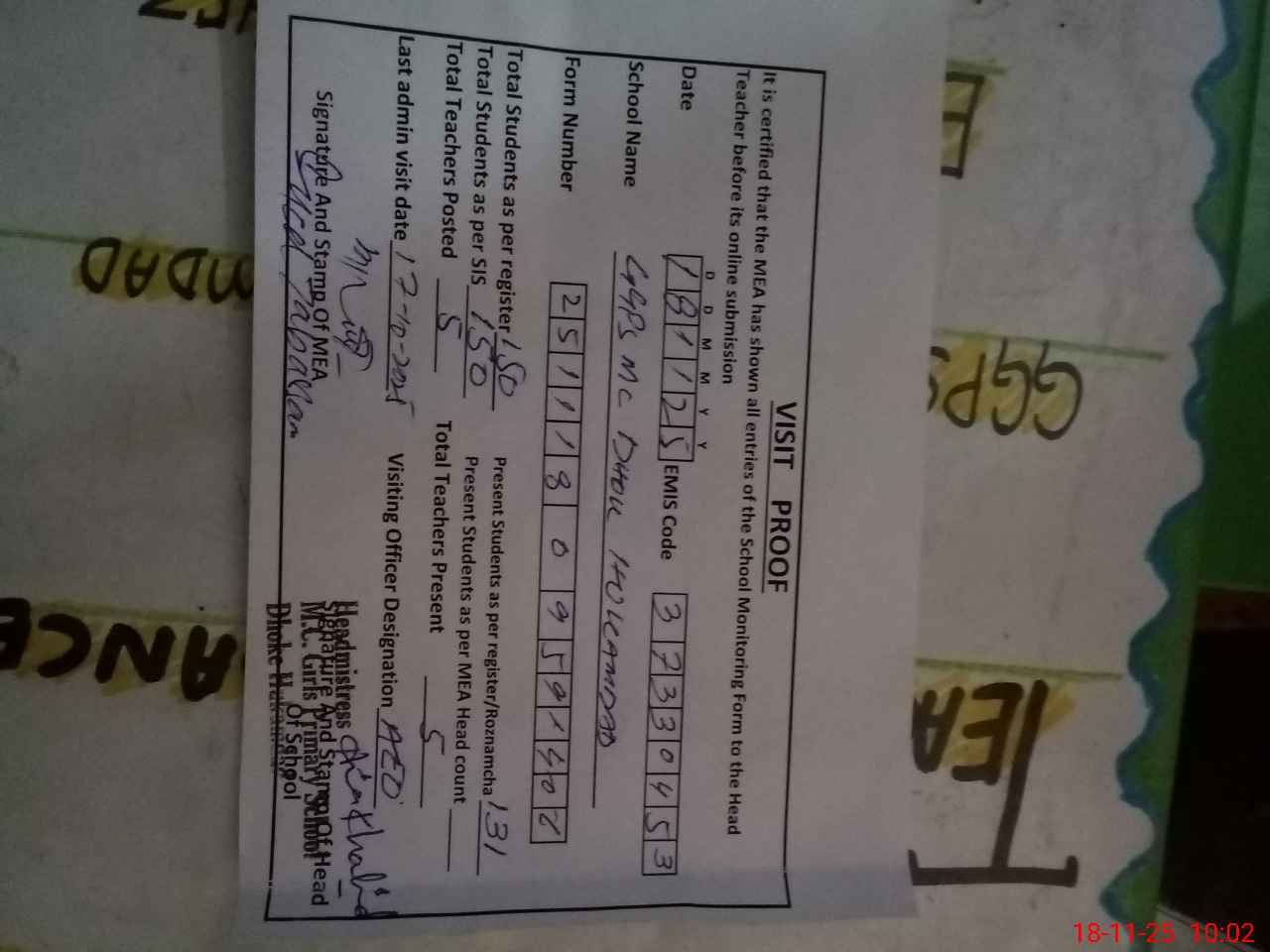 | Attendance Register | Head Teacher | MEA with School | Visit Proof |