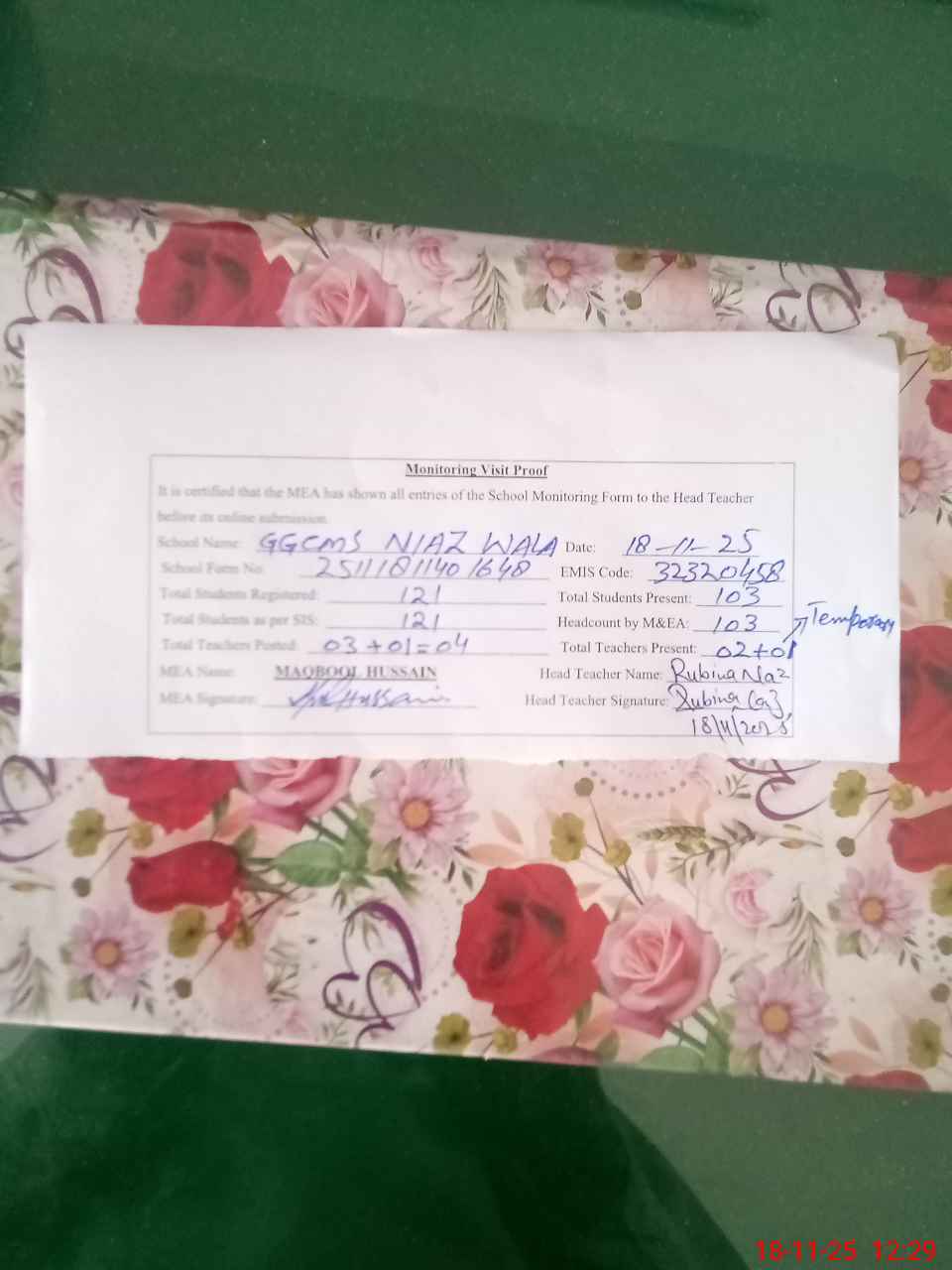 | Attendance Register | Head Teacher | MEA with School | Visit Proof |