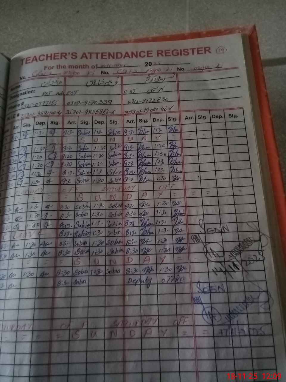 | CNIC | Full Name | Designation | R/C | Absence During Last Calender Month |