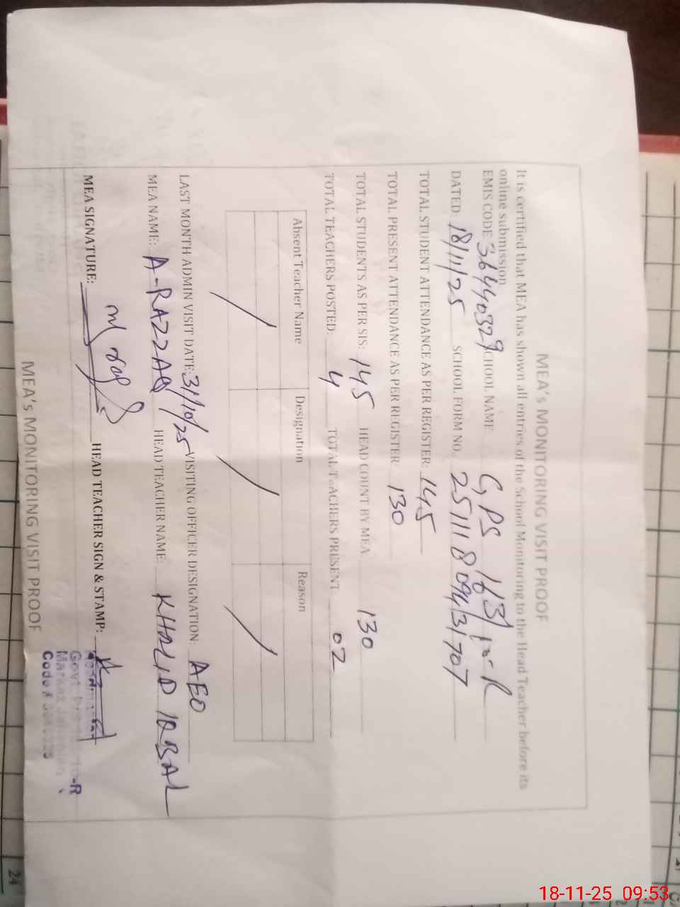 | Attendance Register | Head Teacher | MEA with School | Visit Proof |