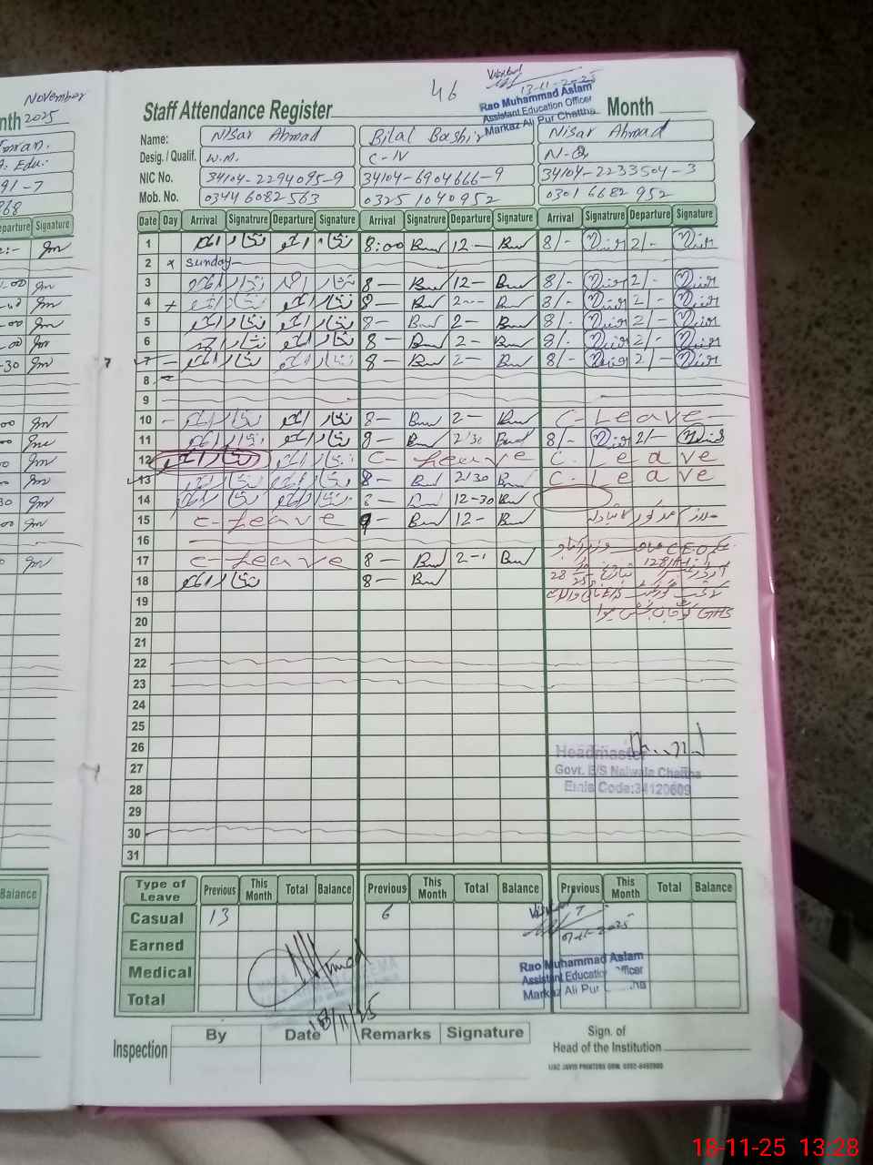 | CNIC | Full Name | Designation | R/C | Absence during last cal. month |
