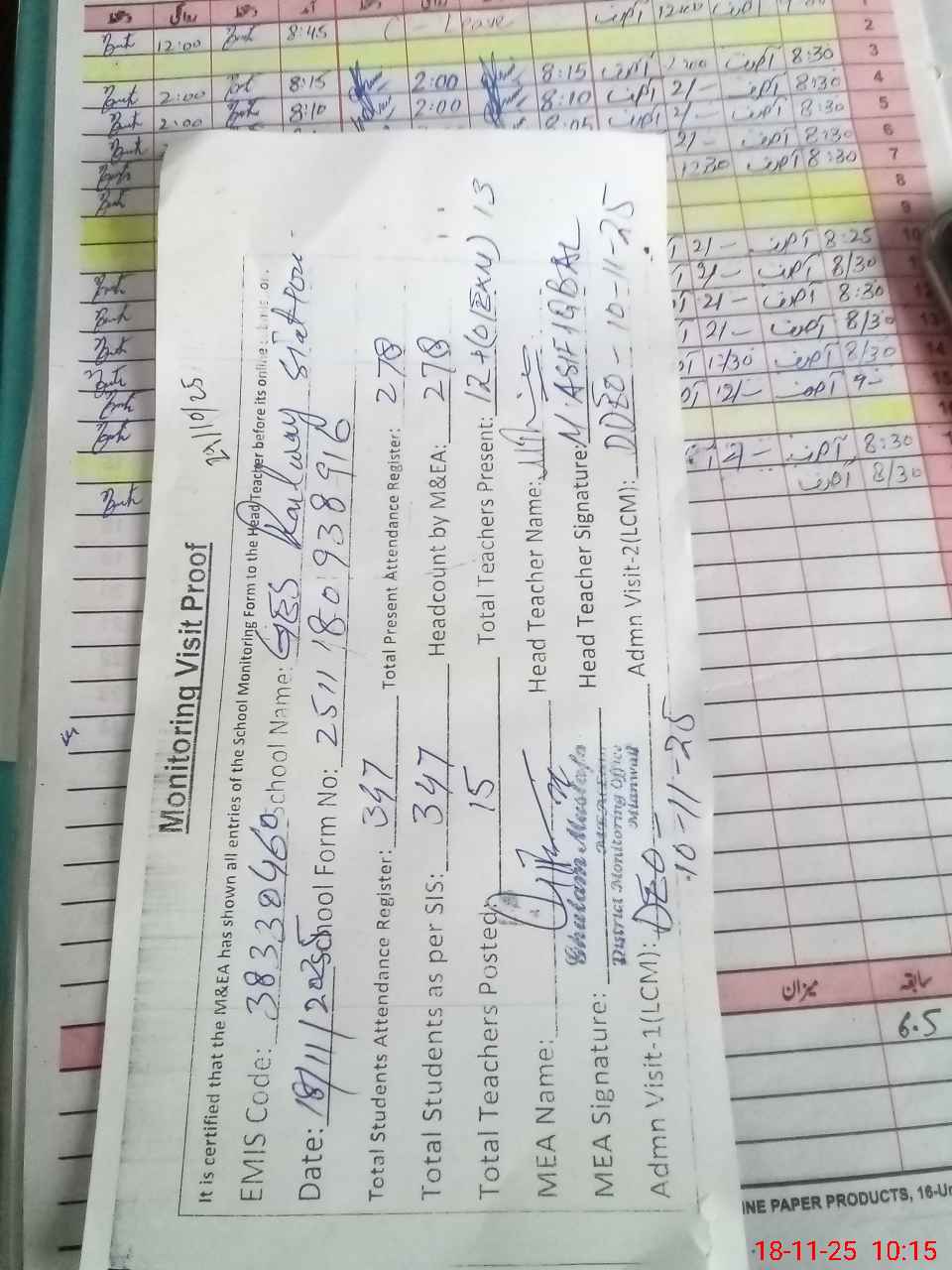 | Monitoring Date: 18-11-2025 | Start Time: 18-11-2025 09:34 AM | End Time: 18-11-2025 10:25 AM | Name of MEA: Gh**** Mu**** | |