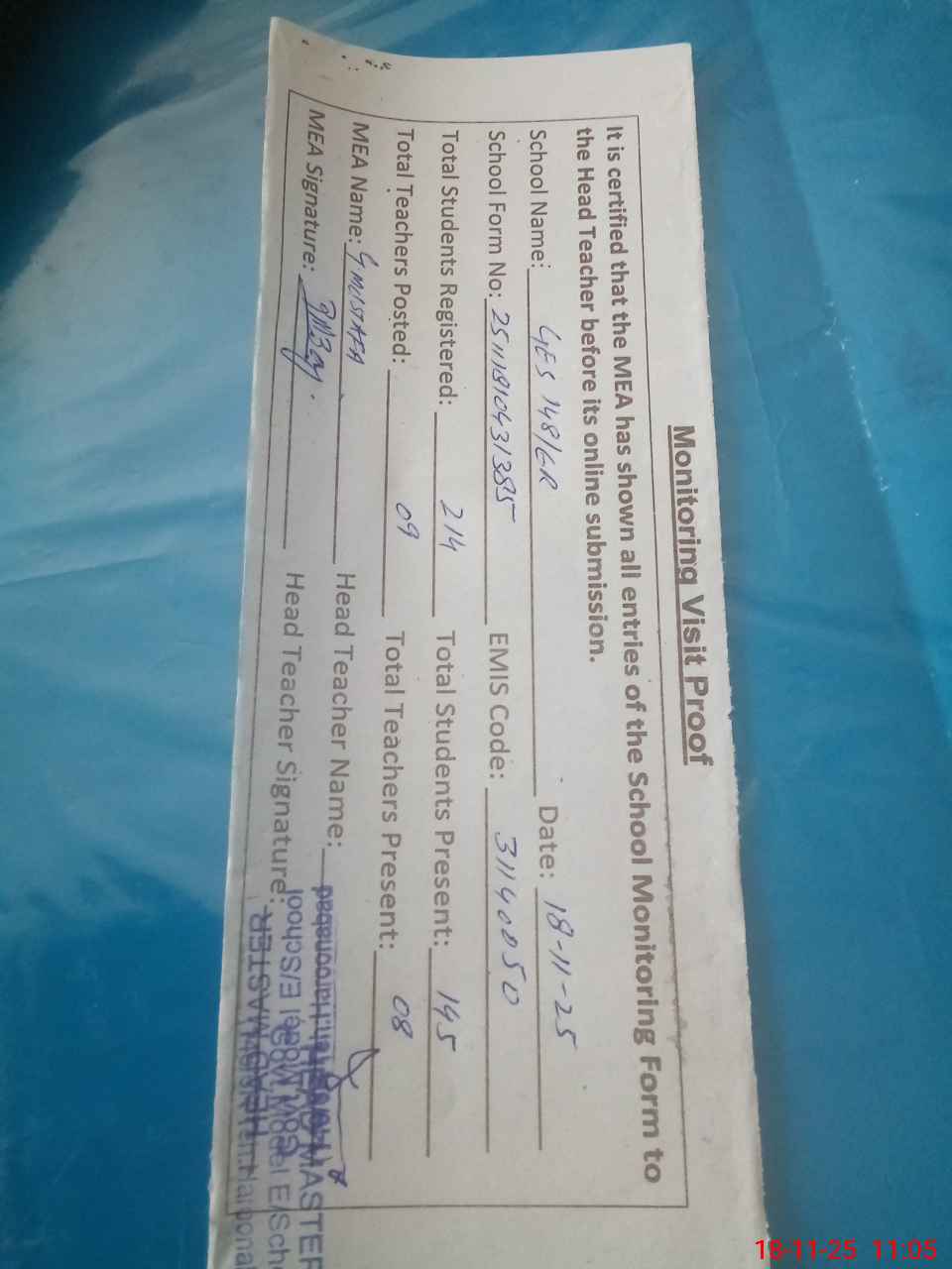 | EMIS Code: 31140050 | Name of School: GES CHAK NO. 148/6-R | |||