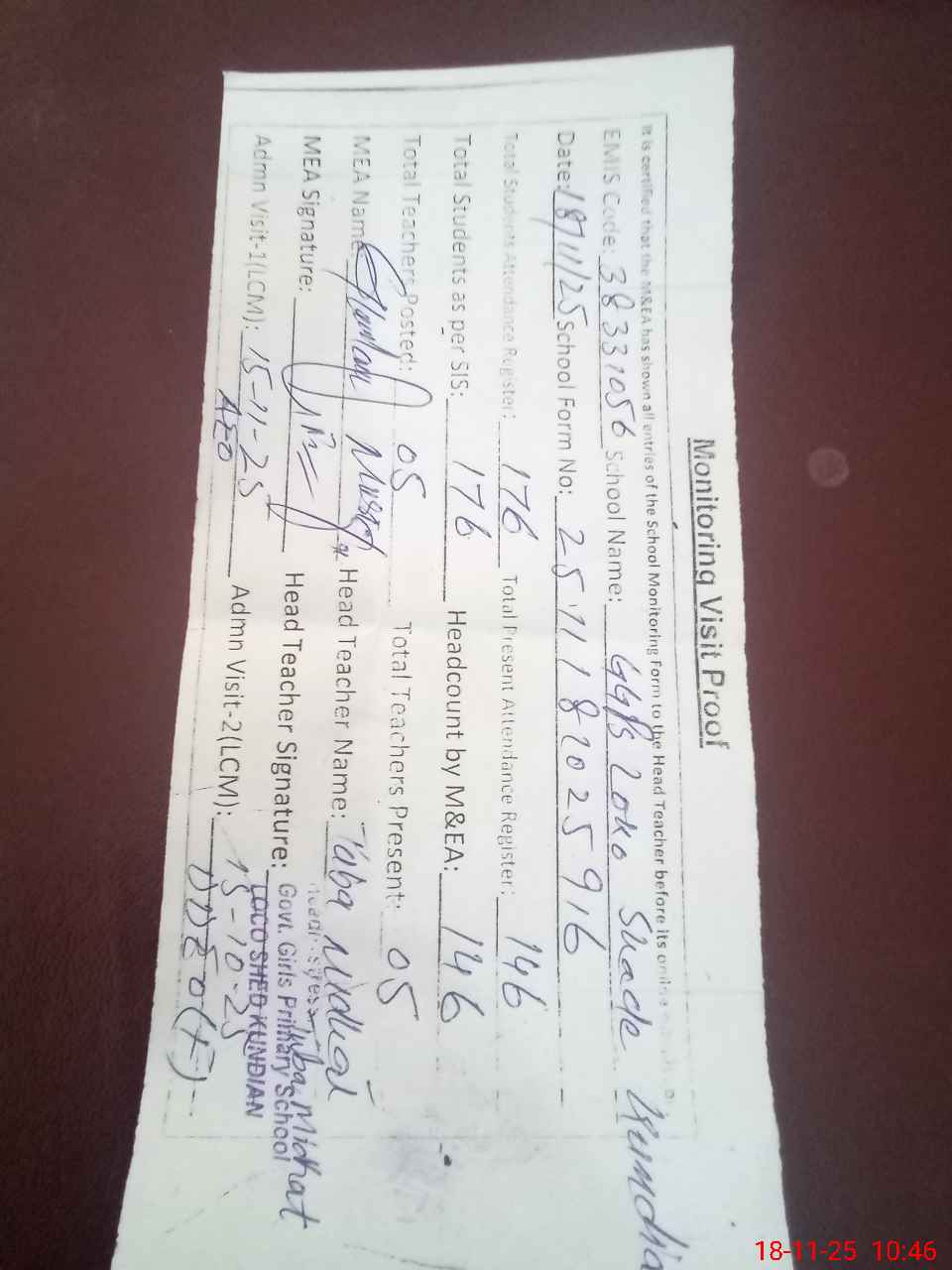 | Monitoring Date: 18-11-2025 | Start Time: 18-11-2025 10:25 AM | End Time: 18-11-2025 11:08 AM | Name of MEA: Gh**** Mu**** | |
