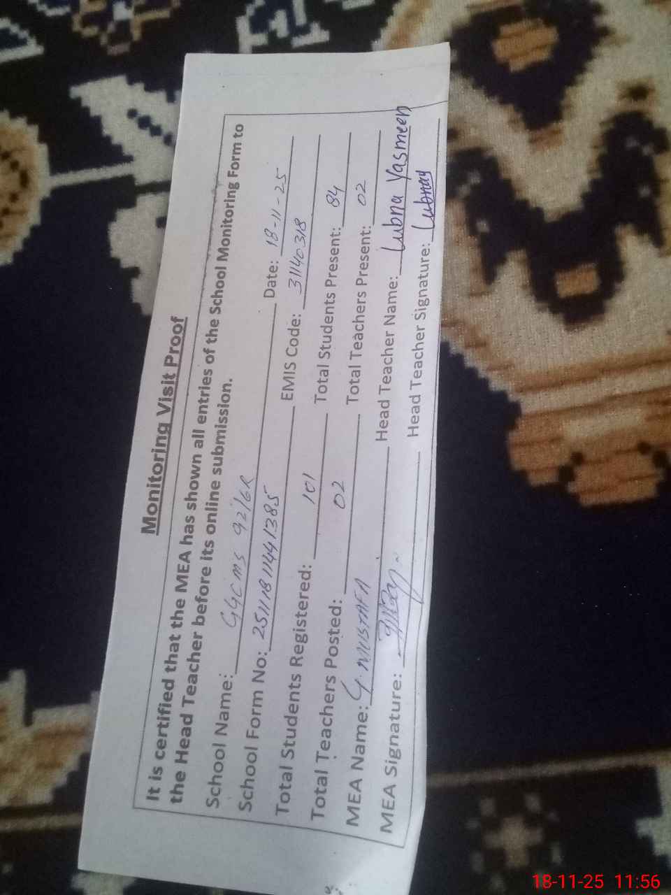 | Attendance Register | Head Teacher | MEA with School | Visit Proof |