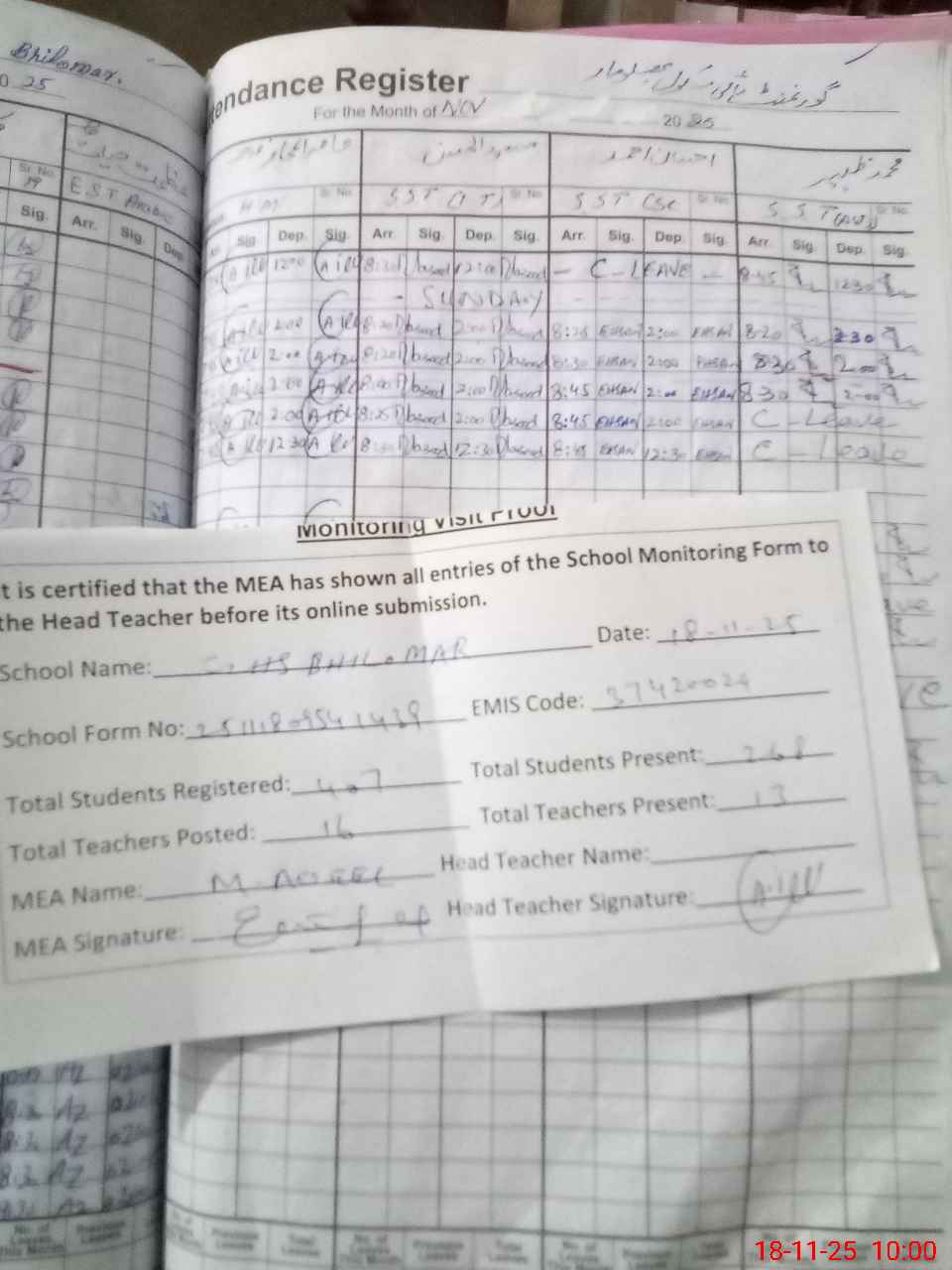 | Attendance Register | Head Teacher | MEA with School | Visit Proof |