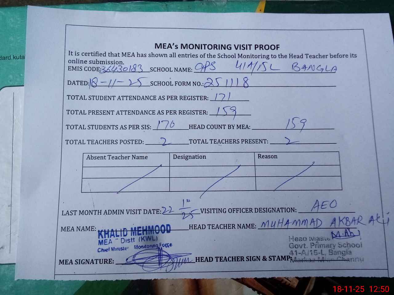 | Attendance Register | Head Teacher | MEA with School | Visit Proof |